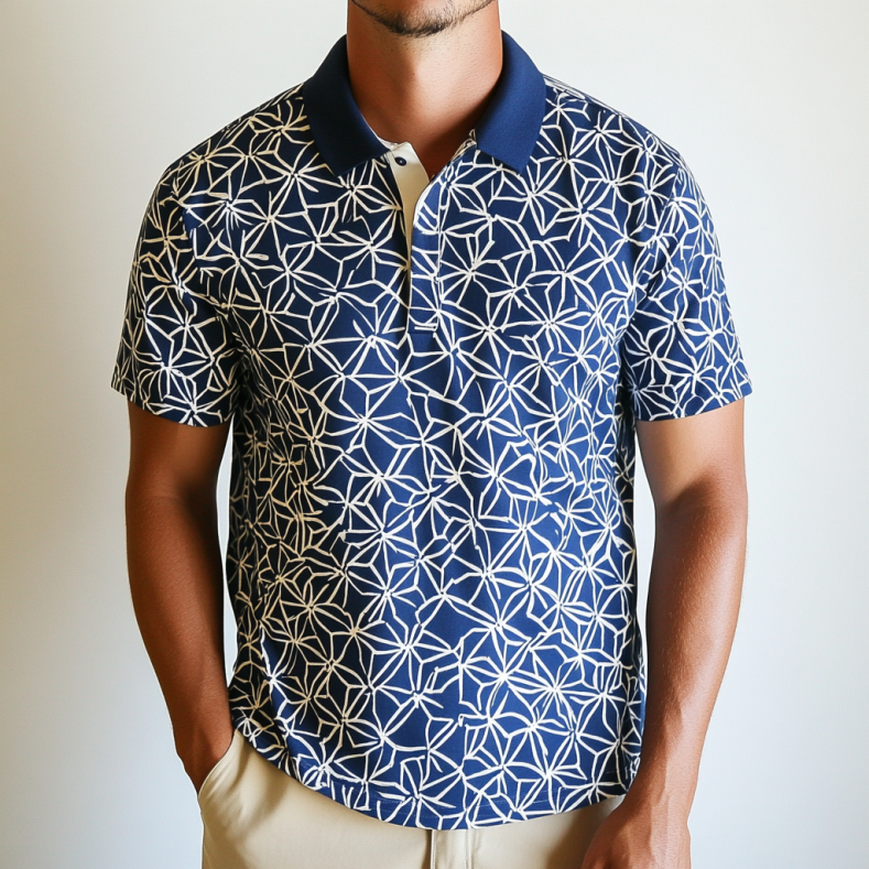 Make a statement with this navy blue polo shirt featuring an all-over white and tan geometric arrow print. Designed with orange accents on the collar and sleeves, this short-sleeve shirt offers a playful yet sophisticated style. Made from durable and soft 100% cotton, it provides all-day comfort and breathability. Perfect for casual outings, workwear, or running errands, this versatile polo is both stylish and practical. The 3-button design and tailored fit ensure a polished look.